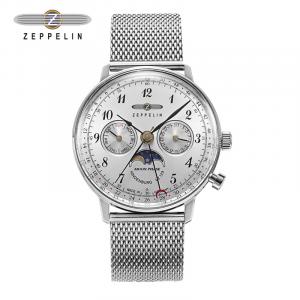 齐博林(zeppelin)德国原装进口商务防水男表皮带真皮石英男士手表计时码表米盘银钢带7086M-4