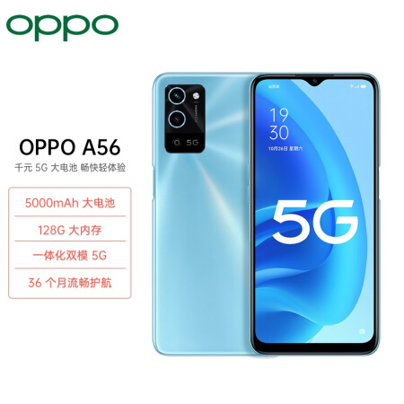 OPPO A56 云烟蓝 4+128GB 一体化双模5G 128G超大存储 5000mAh大电池 5G手机 【顺丰包邮】 【延保一年】